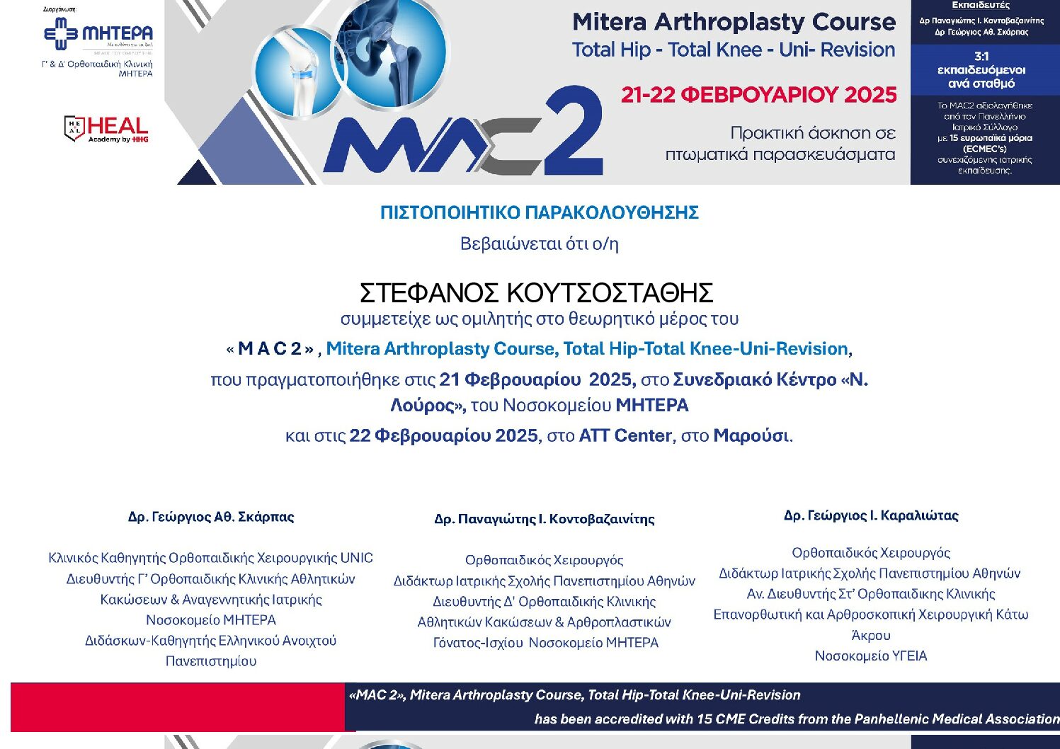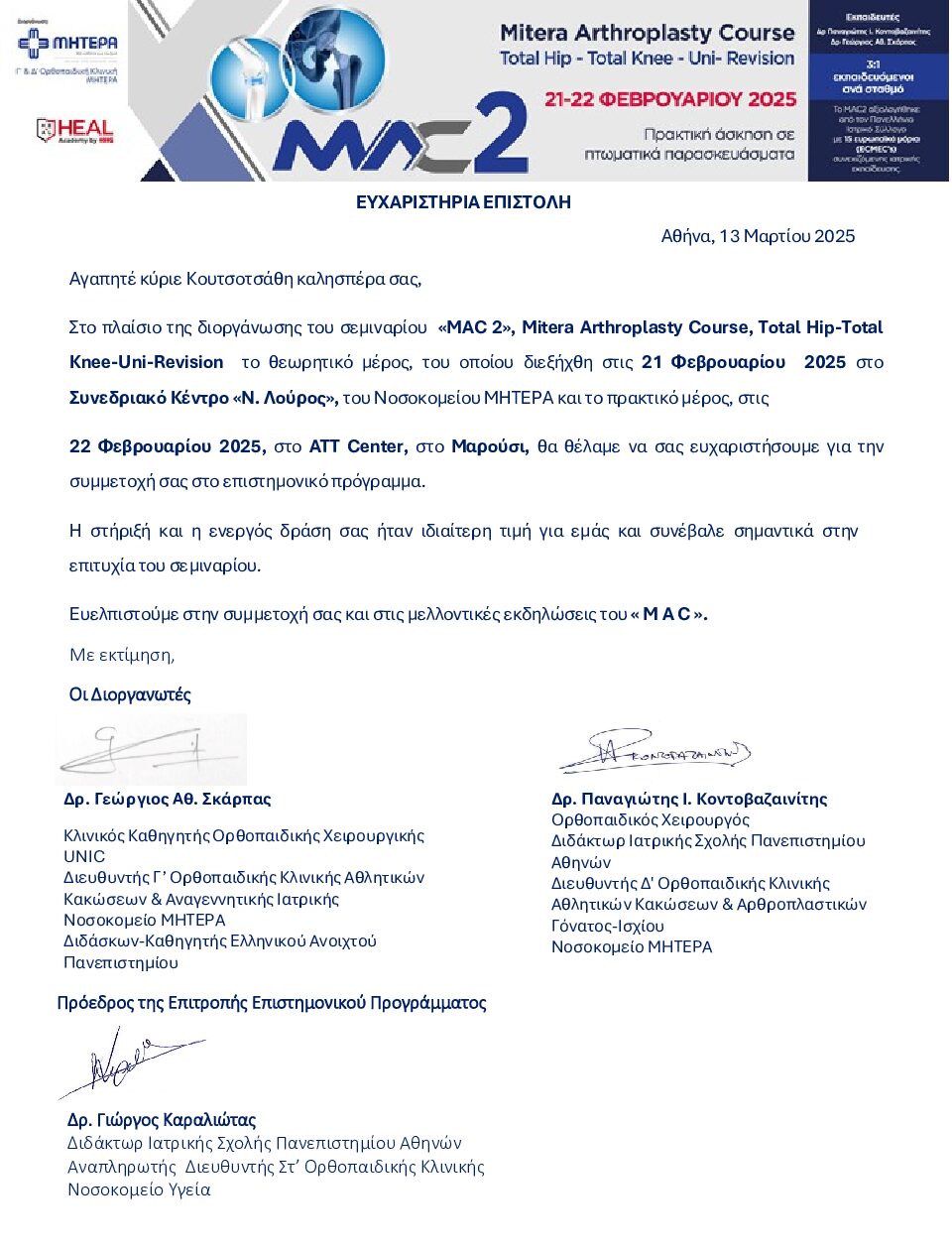Στο πλαίσιο της διοργάνωσης του σεμιναρίου«MAC2», Mitera Arthroplasty Course, Total Hip-Total Knee-Uni-Revision το θεωρητικό μέρος, του οποίου διεξήχθη στις 21 Φεβρουαρίου 2025 στο Συνεδριακό Κέντρο «Ν.Λούρος», τουΝοσοκομείου ΜΗΤΕΡΑ και το πρακτικόμέρος, στις 22Φεβρουαρίου2025, στο ATT Center,στο Μαρούσι, θα θέλαμε κ. Κουτσοστάθη να σας  ευχαριστήσουμε για την συμμετοχή σας στο επιστημονικό πρόγραμμα.