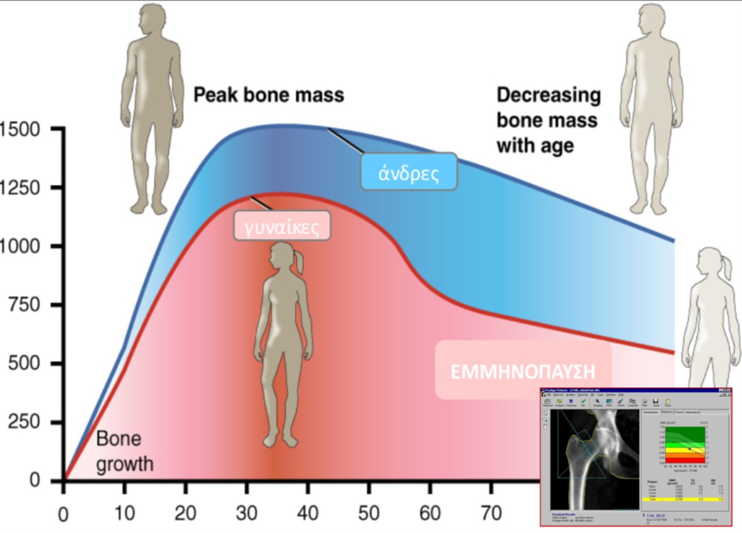 H εικόνα 1, αποτυπώνει τη σταδιακή μείωση της οστικής πυκνότητας με το χρόνο σε άνδρες και γυναίκες, πιο έντονη στις γυναίκες τα πρώτα χρόνια μετά την εμμηνόπαυση.