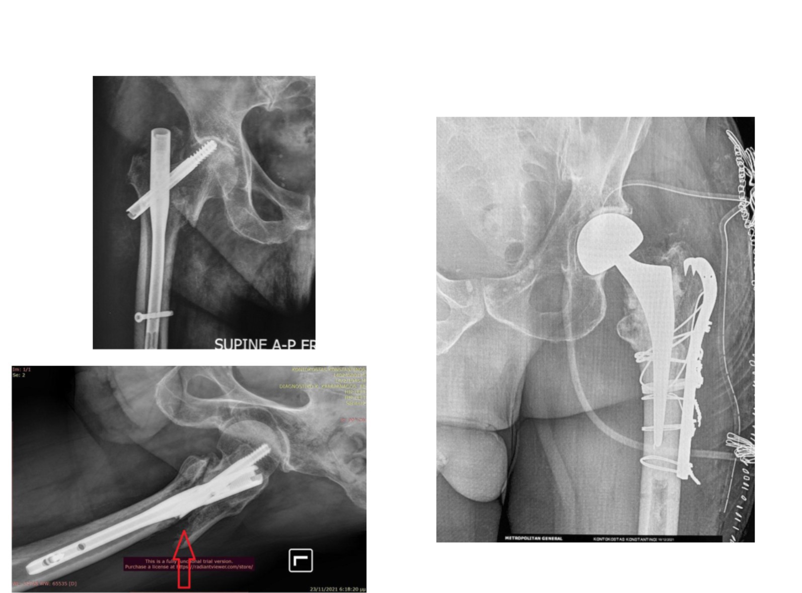 Στην εικόνα 10, ήλος που τοποθετήθηκε εξ’αρχής σε λάθος θέση, χωρίς πρώτα να έχει επιτευχθεί ικανοποιητική ανάταξη στο κάταγμα: η κινητοποίηση οδήγησε σε αποτυχία στο πρώτο μετεγχειρητικό τρίμηνο. Αντιμετωπίστηκε από την κλινική μας με οστεσύνθεση και αρθροπλαστική.