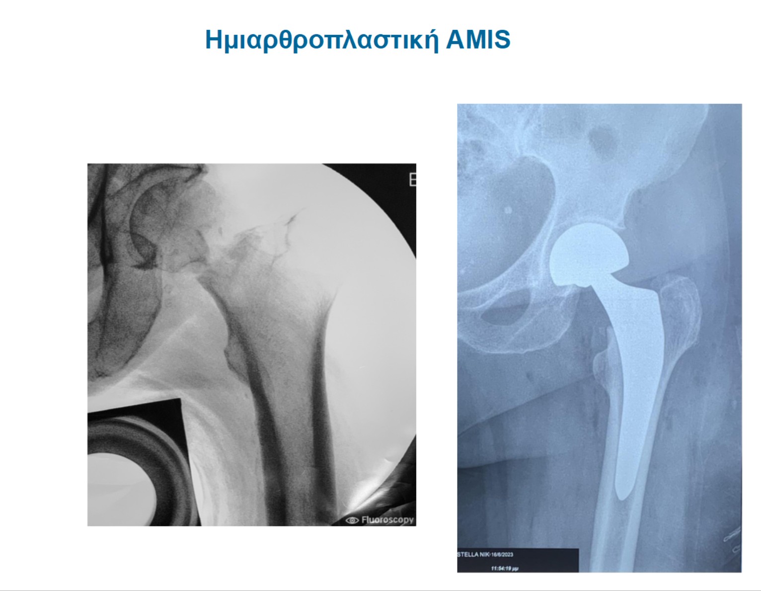 Στις εικόνα 11 και εικόνα 12 ημιαρθροπλαστική AMIS για υποκεφαλικό κάταγμα ισχίου, από προσωπικό αρχείο