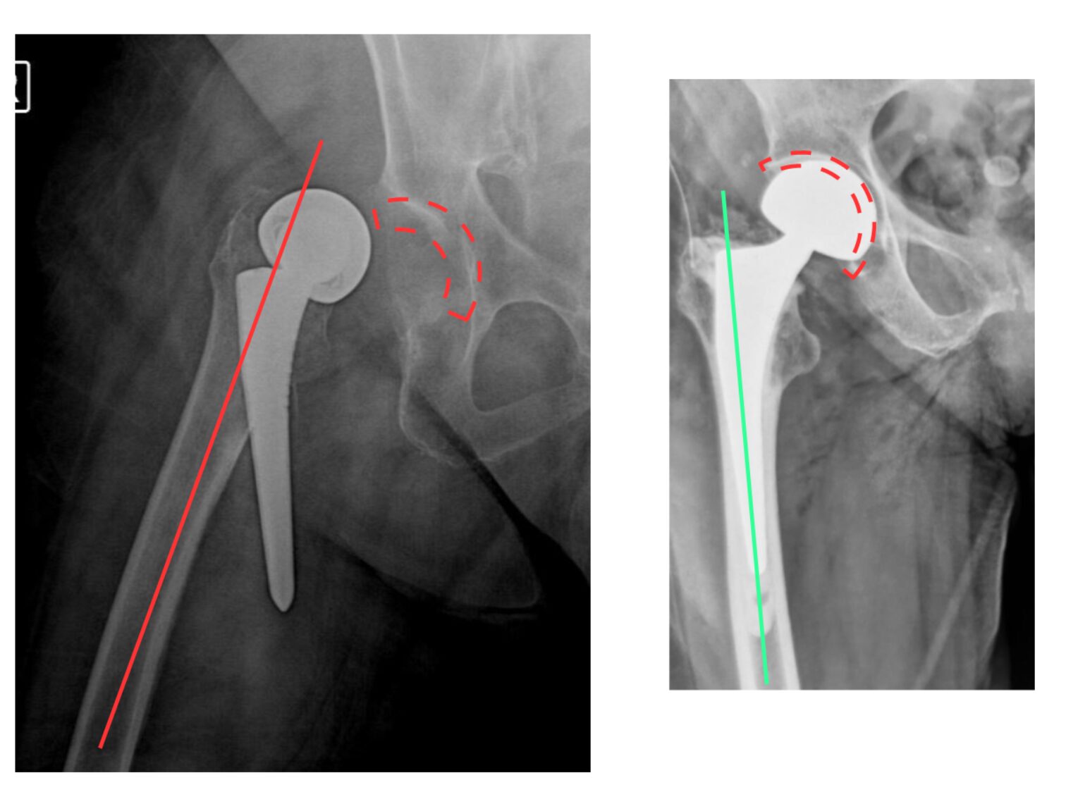 Χωρίς ικανή εμπειρία, επιπλοκές μπορεί να συμβούν: στην εικόνα 13, στην αριστερή πλευρά ημιαρθροπλαστική AMIS στην οποία τοποθετήθηκε ολόκληρος ο στυλεός του μηριαίου εκτός του αυλού. Ο ασθενής κινητοποιήθηκε την επομένη με αφόρητο πόνο σε εξάρθρημα. Όσο κι αν φαίνεται απίθανο, είναι μια επιπλοκή που μπορεί να συμβεί σε μη έμπειρα χέρια. Δεξιά στην εικόνα φαίνεται ο ορθός τρόπος τοποθέτησης του στυλεού.