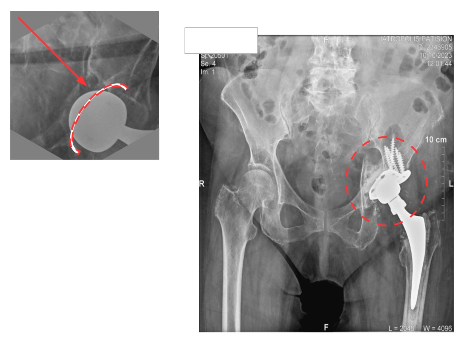 Στην εικόνα 14, κατά τη διάρκεια ημιαρθροπλαστικής AMIS, η απειρία οδήγησε σε εργώδεις προσπάθειες ανάταξης και κάταγμα κοτύλης. Αντιμετωπίστηκε στην κλινική μας με ειδικού τύπου πρόθεση κοτύλης του τύπου της αναθεώρησης αρθροπλαστικής (revision hip arthroplasty)