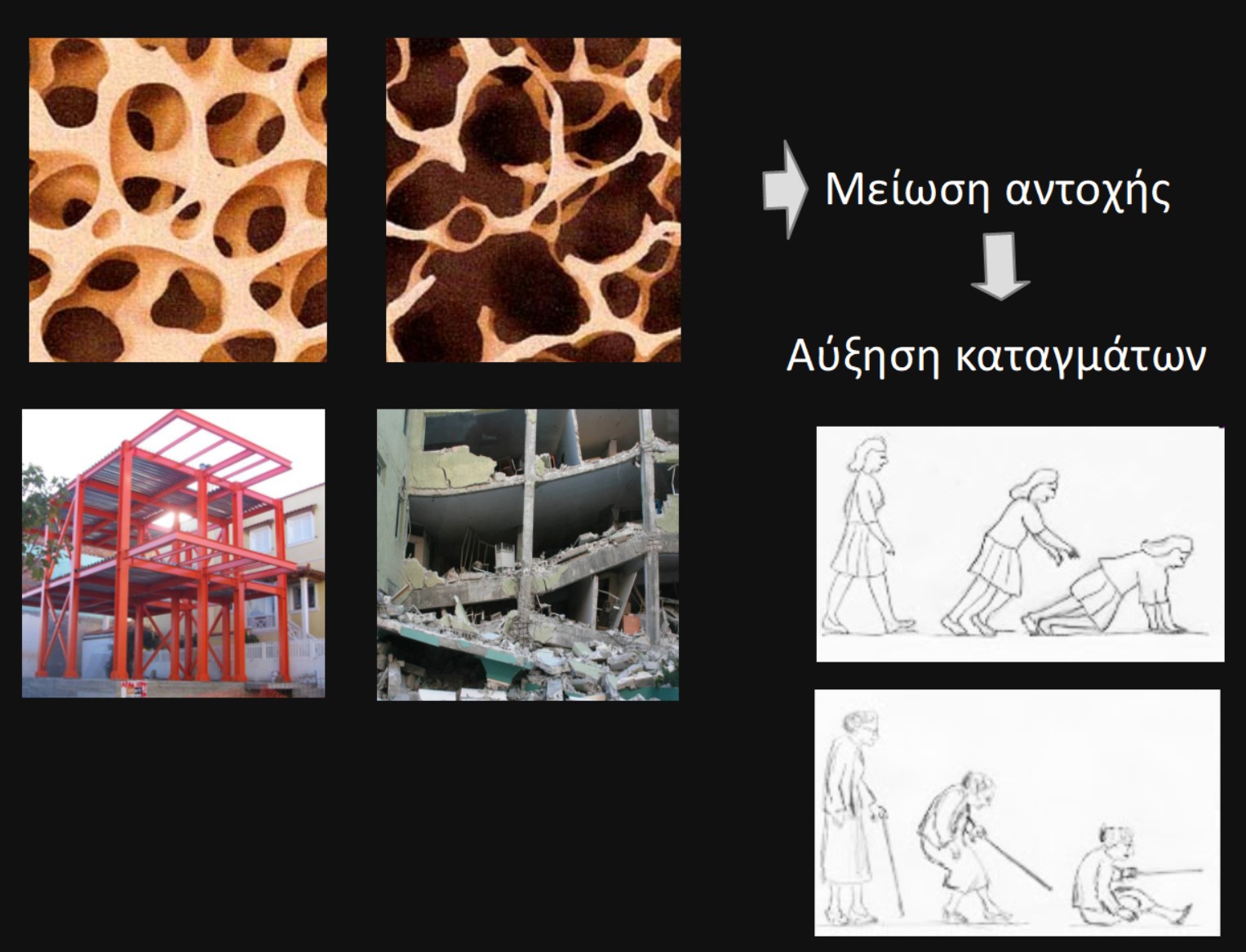 Στην εικόνα 2 απεικονίζεται παραστατικά η διαφορά στη δομή του υγιούς από το οστεοπορωτικό οστό και η συνακόλουθη ευπάθεια του δεύτερου σε κάταγμα.