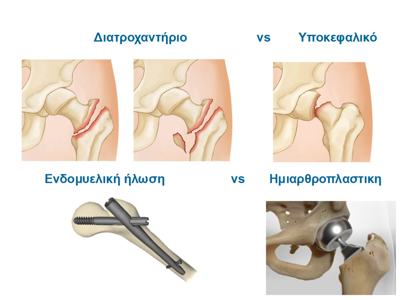 Υπάρχουν δύο κύριες κατηγορίες καταγμάτων ισχίου, που αντιμετωπίζονται με διαφορετική θεραπευτική φιλοσοφία η κάθε μία: