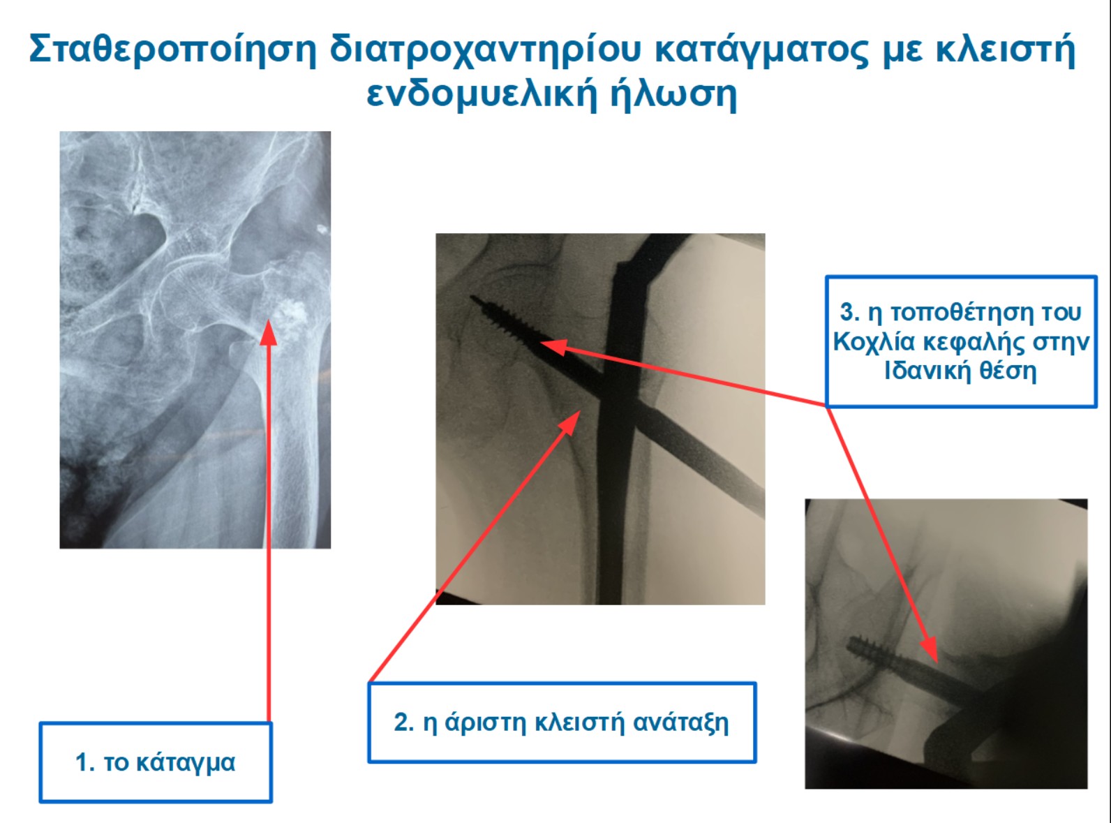 Είναι γνωστό στην ορθοπαιδική κοινότητα ότι το διατροχαντήριο κάταγμα είναι το πρώτο “εκπαιδευτικό” κάταγμα, αυτό στο οποίο οι νέοι γιατροί μαθαίνουν τις αρχές της χειρουργικής Τέχνης. Είναι λοιπόν ένα εύκολο και απλό κάταγμα; η απάντηση είναι σαφώς και όχι. Γίνεται απλό όταν υπάρχει βαθιά γνώση των σταδίων της επέμβασης και δυνατότητα αντιμετώπισης δυσκολιών που θα προκύψουν στην πορεία, παράδειγμα: